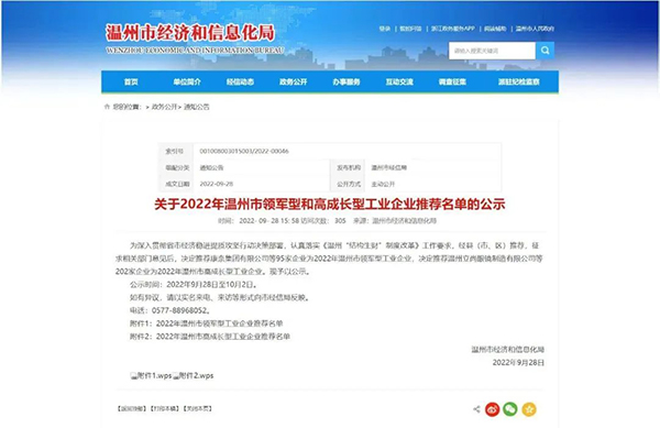 近日,溫州市經濟和信息化局發布了《2022年溫州市領軍型和高成長型工業企業推薦名單》,決定推薦95家企業為2022年溫州市領軍型工業企業,決定推薦202家企業為2022年溫州市高成長型工業企業。