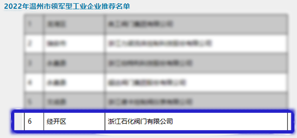 其中,浙江石化閥門有限公司榮獲2022年溫州市領軍型工業企業。